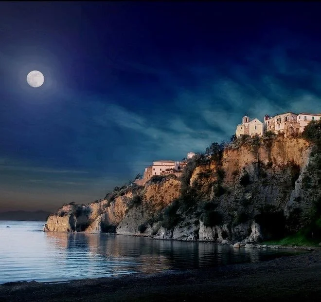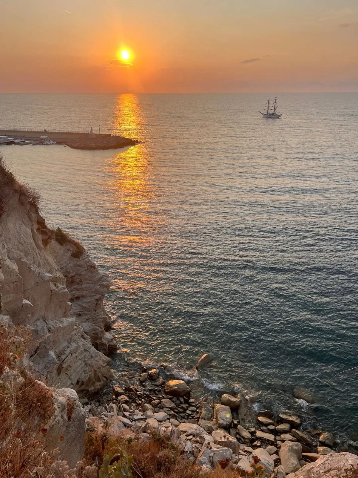 un borgo affacciato sul mare, con un centro storico che sembra un balcone sulla costa e tramonti che colorano il cielo di arancio e rosa.
